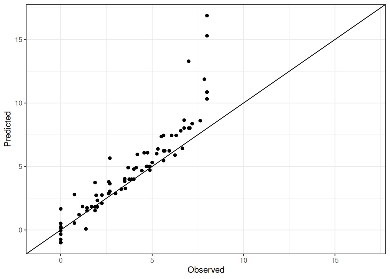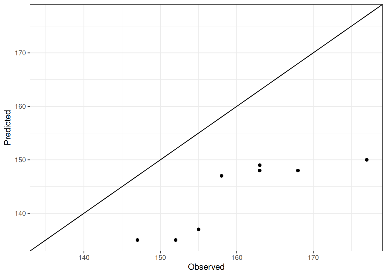 The range of observed and predicted values are estimated using data in this page, which may be misleading for the narrow ranges of observed and predicted values.