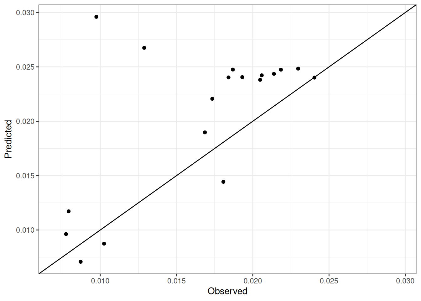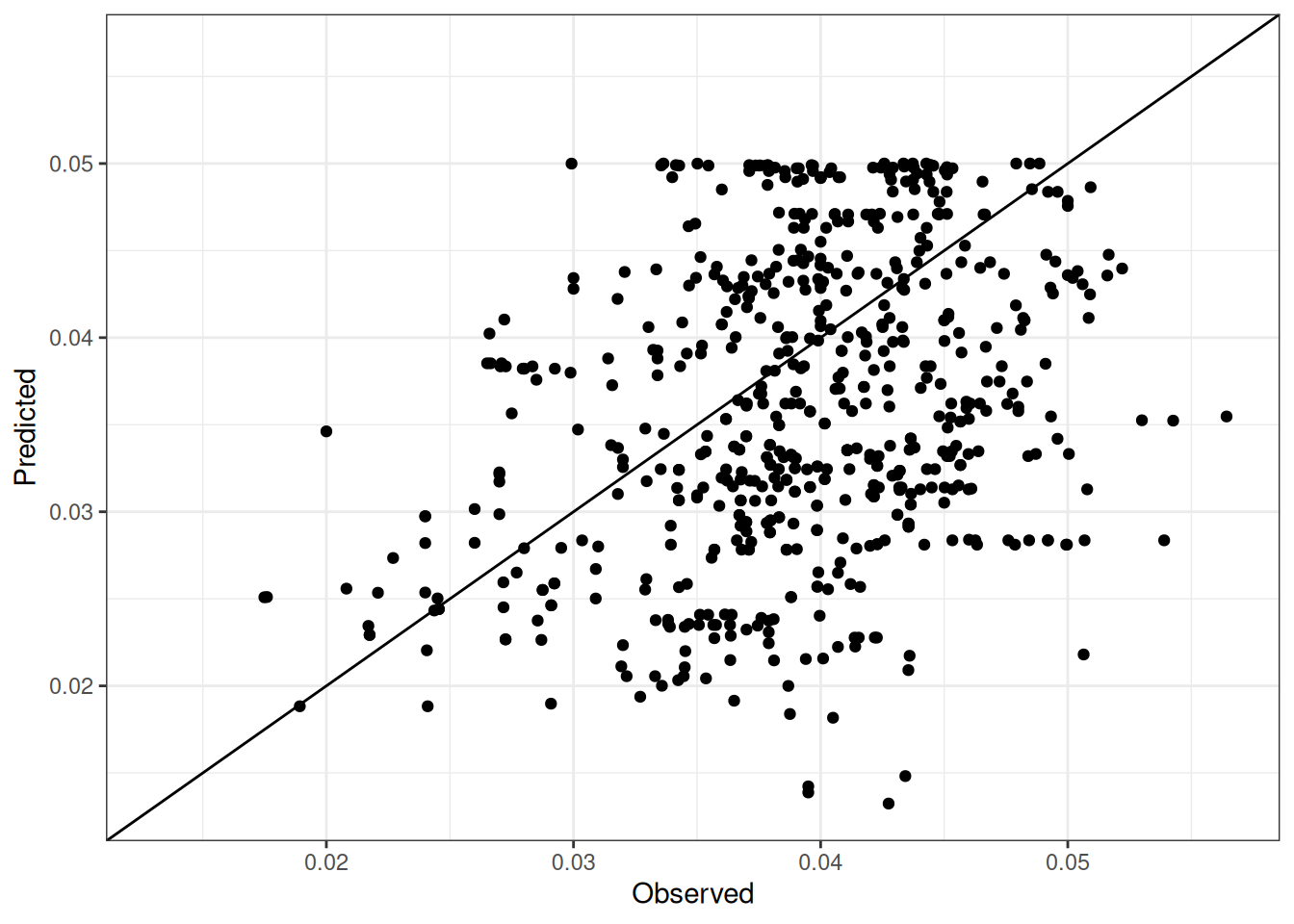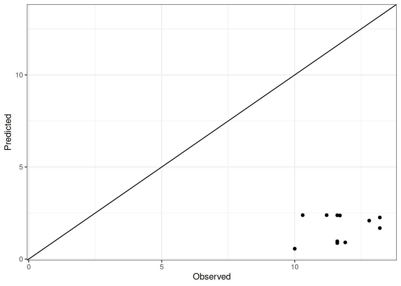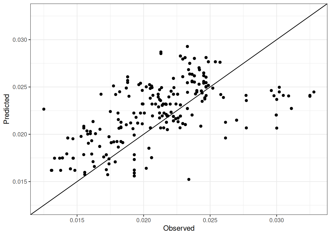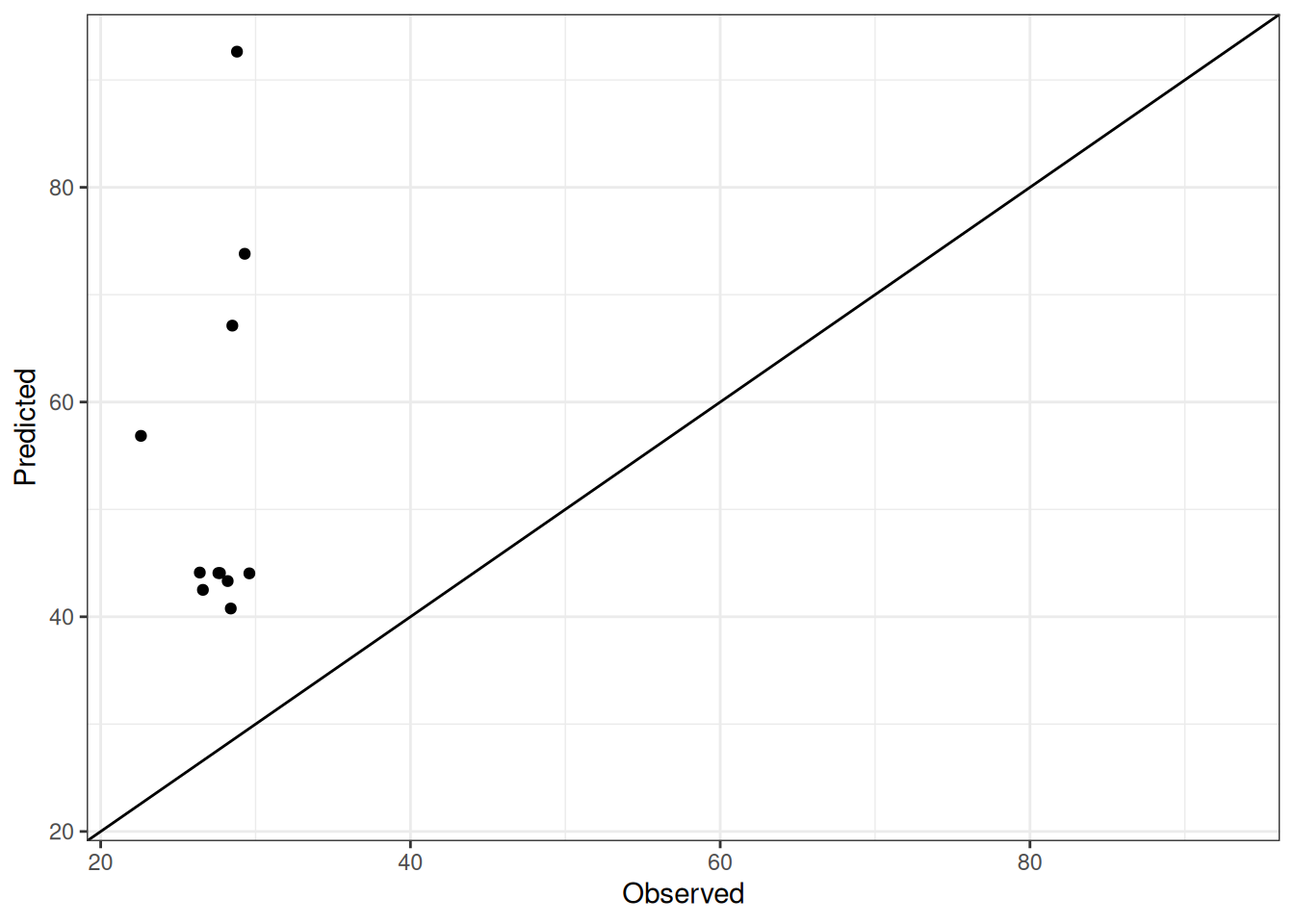 The range of observed and predicted values are estimated using data in this page, which may be misleading for the narrow ranges of observed and predicted values.