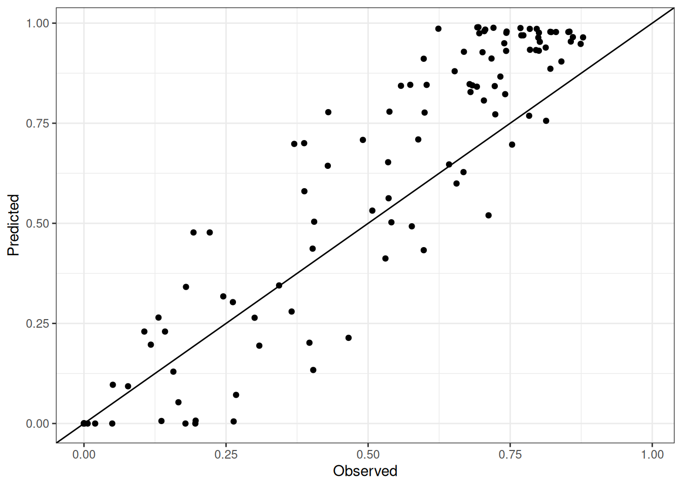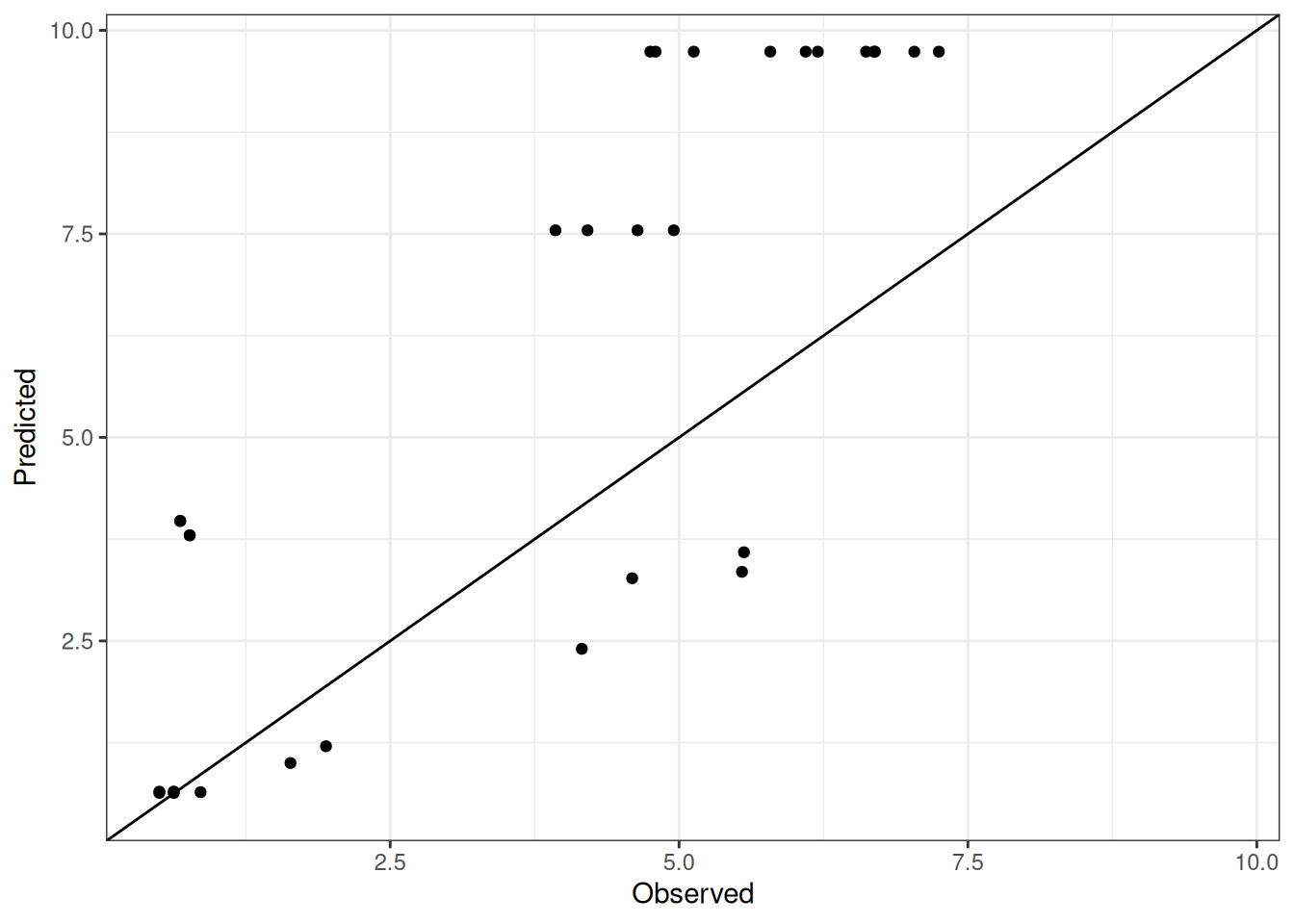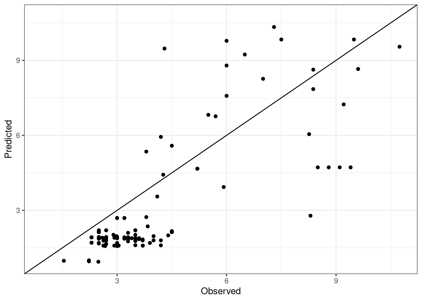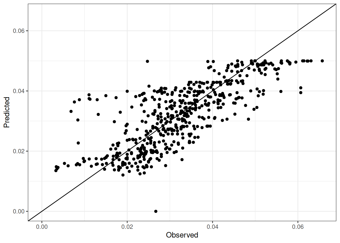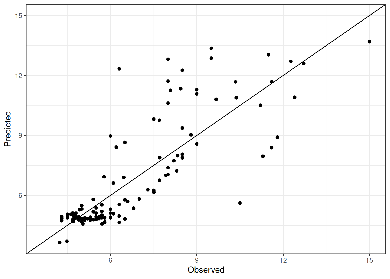 The range of observed and predicted values are estimated using data in this page, which may be misleading for the narrow ranges of observed and predicted values.