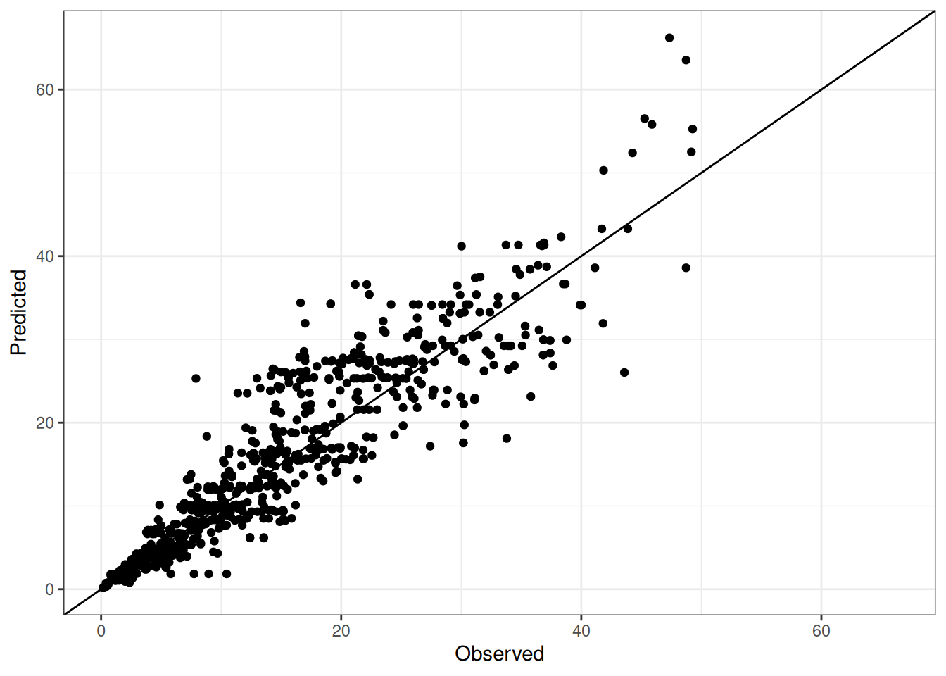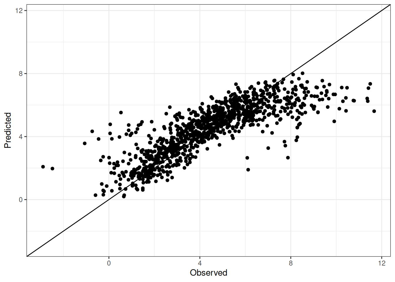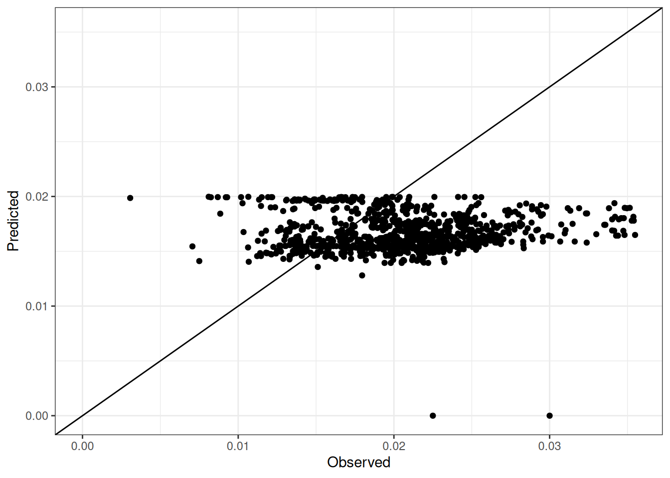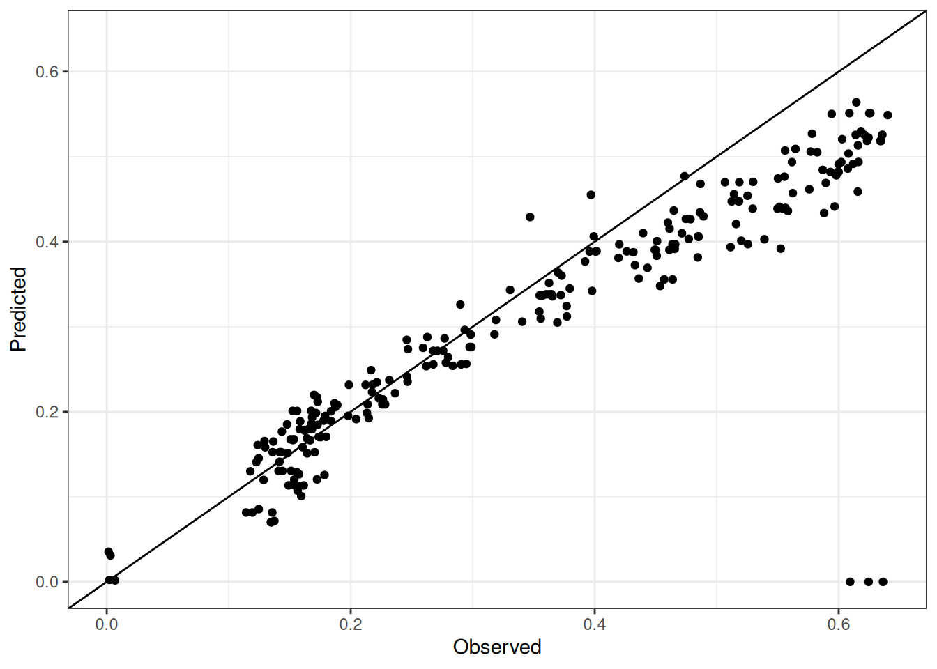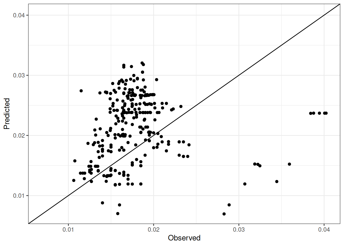 The range of observed and predicted values are estimated using data in this page, which may be misleading for the narrow ranges of observed and predicted values.