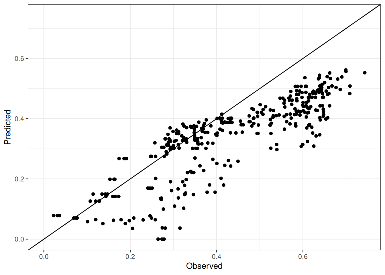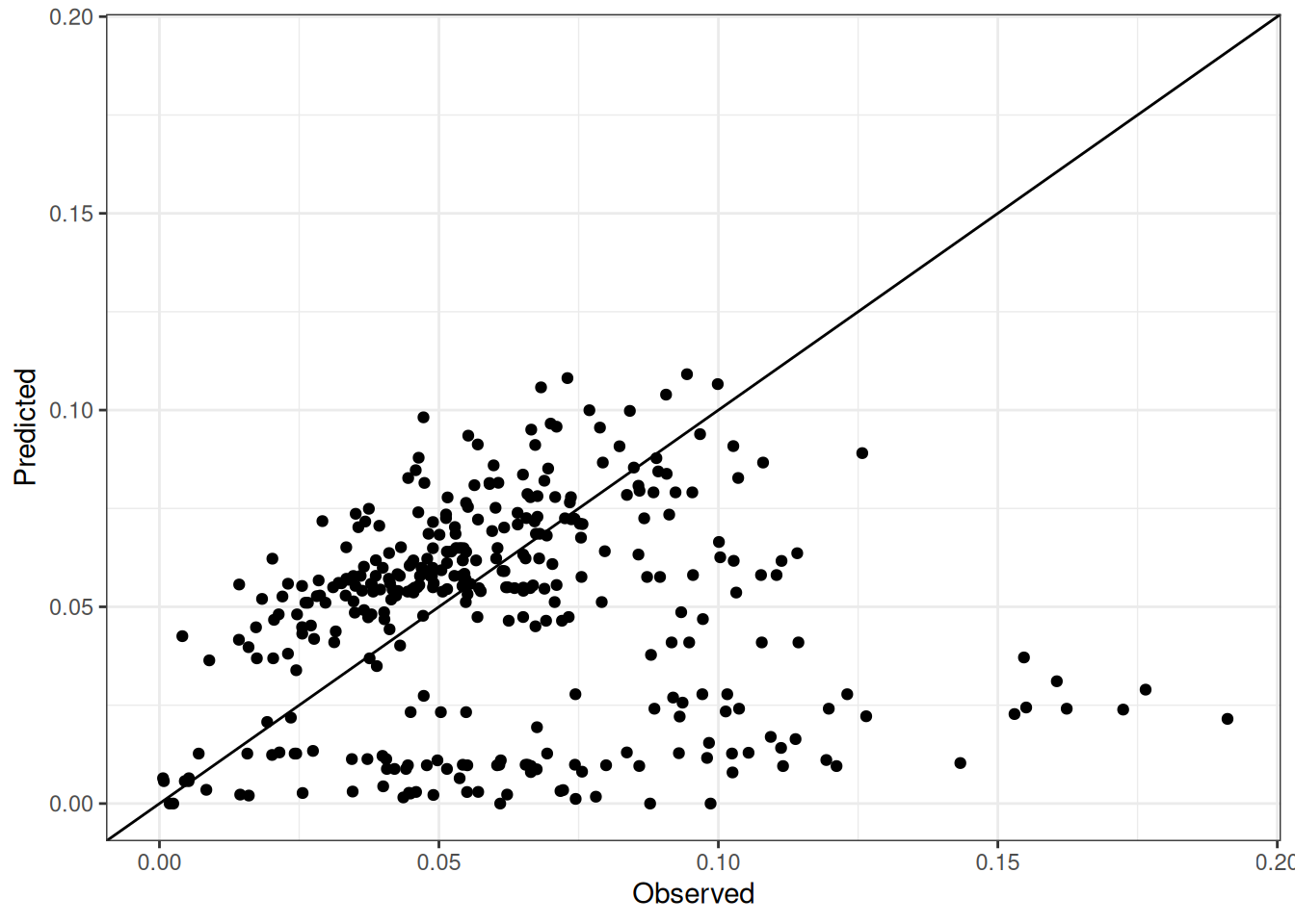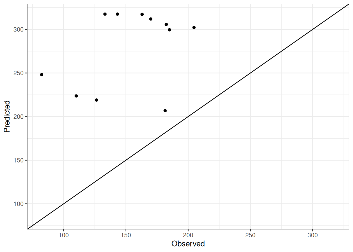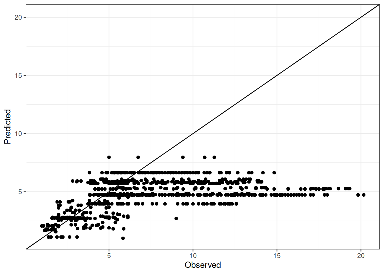 The range of observed and predicted values are estimated using data in this page, which may be misleading for the narrow ranges of observed and predicted values.