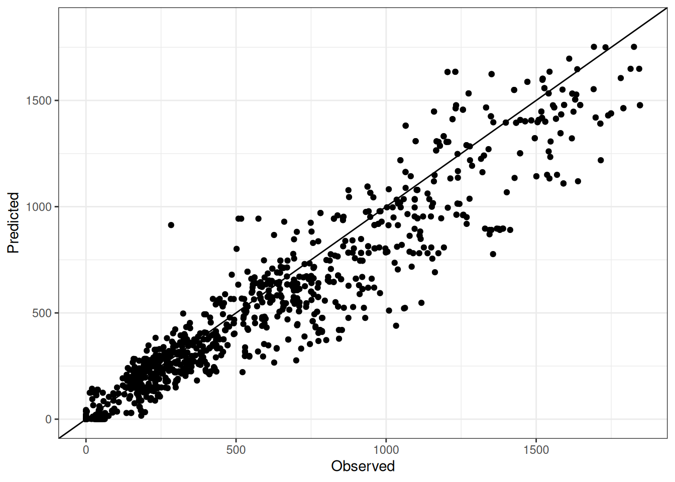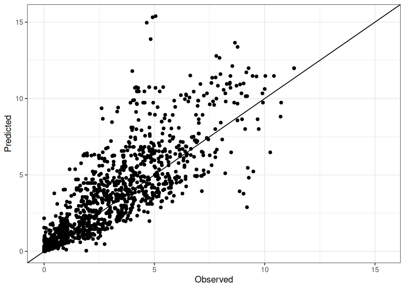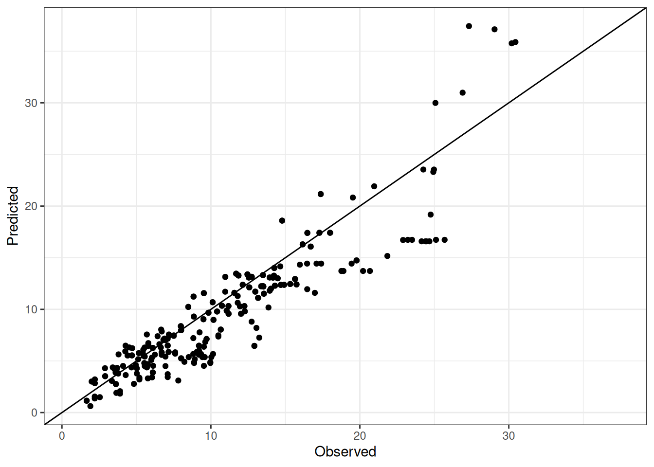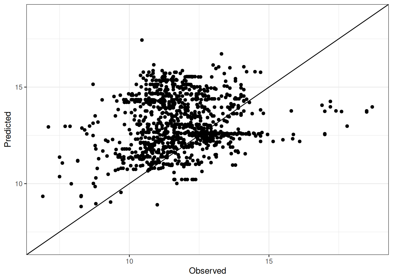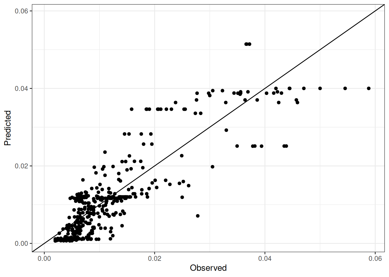 The range of observed and predicted values are estimated using data in this page, which may be misleading for the narrow ranges of observed and predicted values.