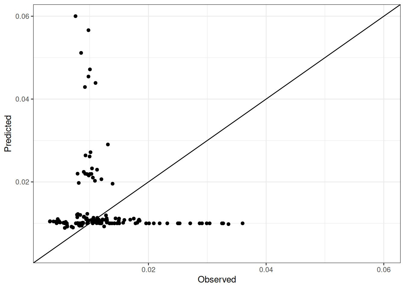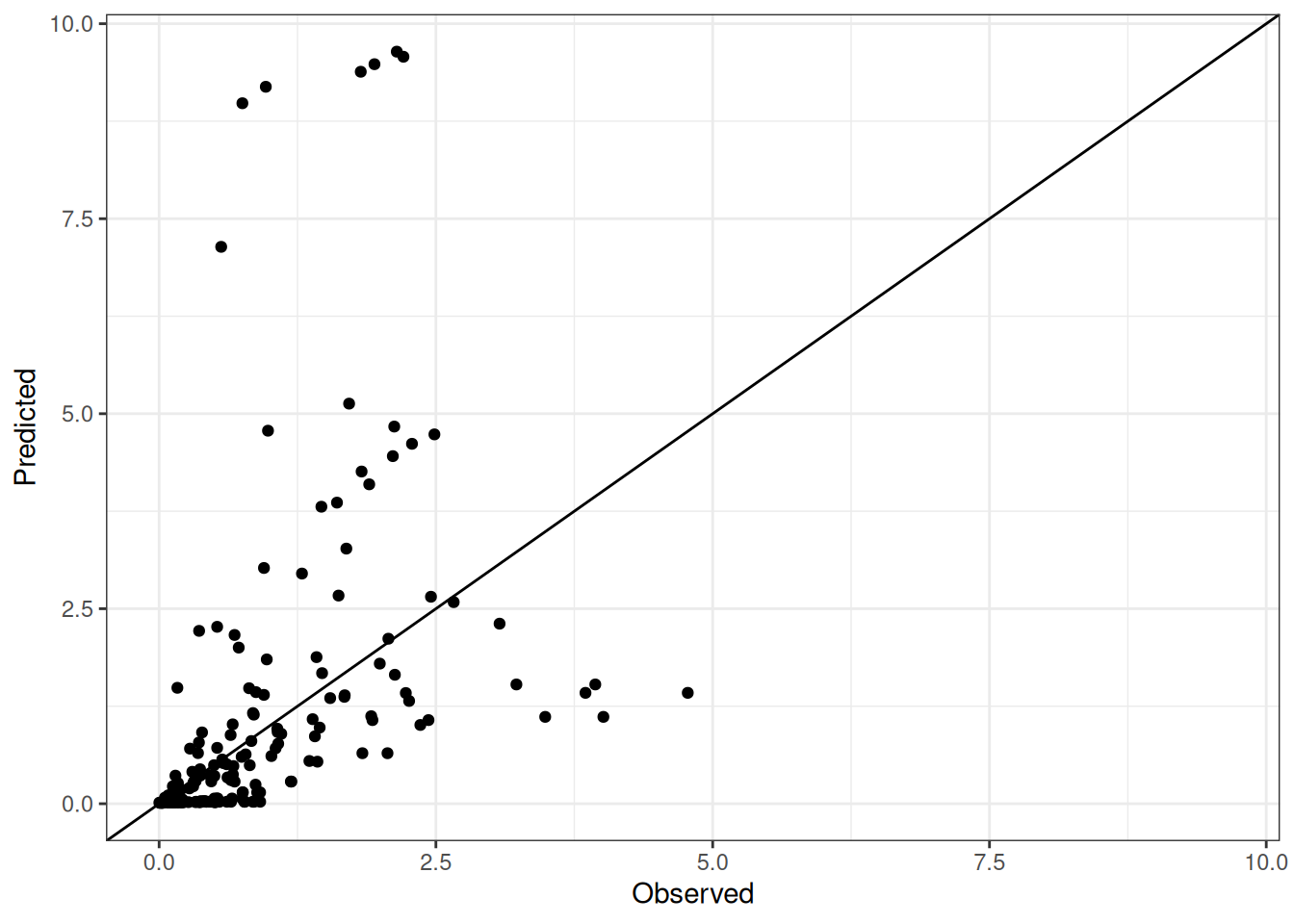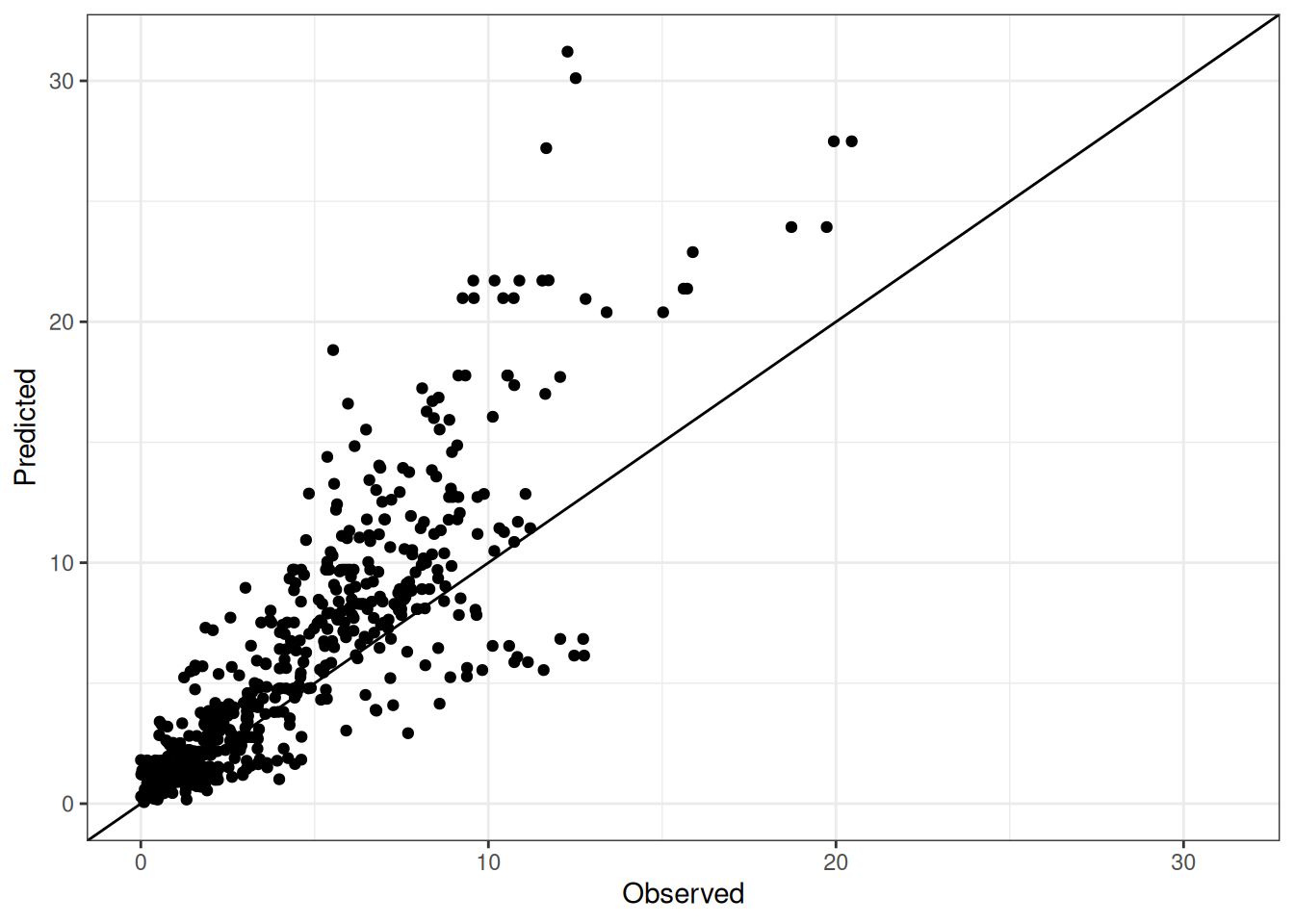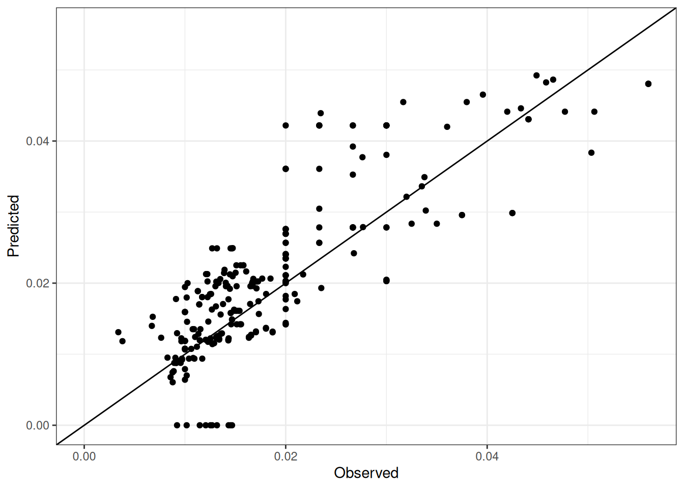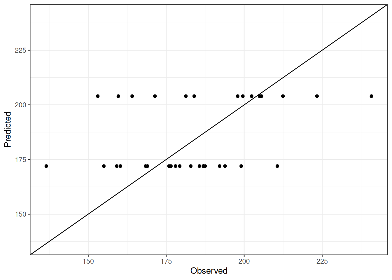 The range of observed and predicted values are estimated using data in this page, which may be misleading for the narrow ranges of observed and predicted values.